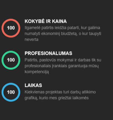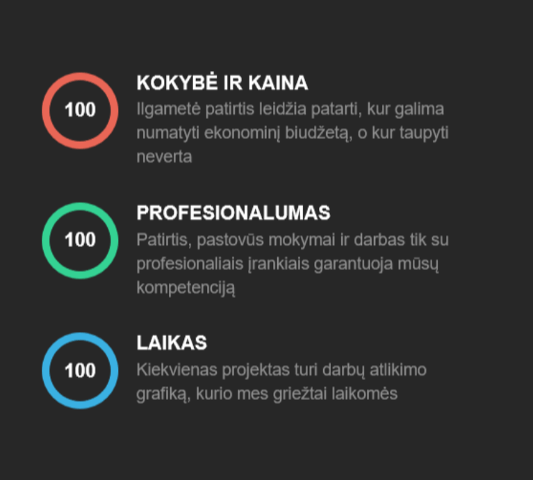 Visi esame savo srities profesionalai, mylintys savo darbą. Tai garantuoja, kad užsakymai bus atlikti kokybiškai, laiku ir laikantis sutarto biudžeto.